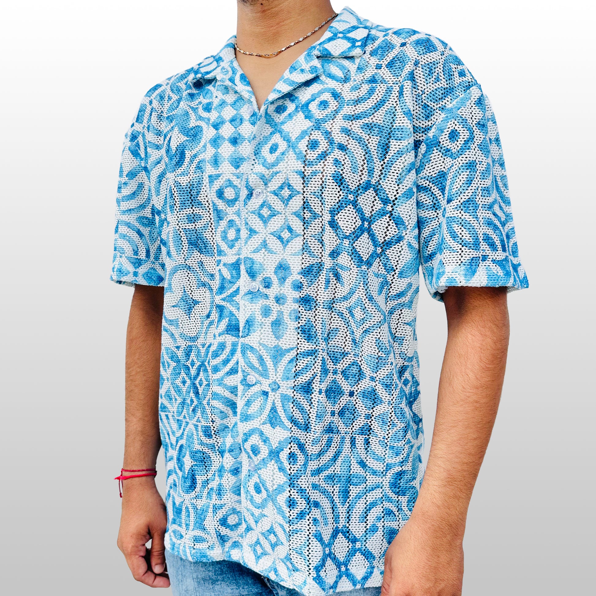 The Coastal Bloom Shirt is a celebration of texture and color, perfect for sophisticated summer wear. This piece features a striking blue and white pattern with an organic, flowing motif that resembles sun-drenched tiles or abstract florals. The garment is crafted from a soft, breathable knit that offers a lightweight feel and rich, tactile depth. Its relaxed fit and classic resort collar make it an essential statement for seaside travel or a vibrant day in the city. Pair this shirt with crisp white trousers or light beige chinos to let the blue pattern stand out, or wear it open over a white tank for an effortless, resort-ready look.