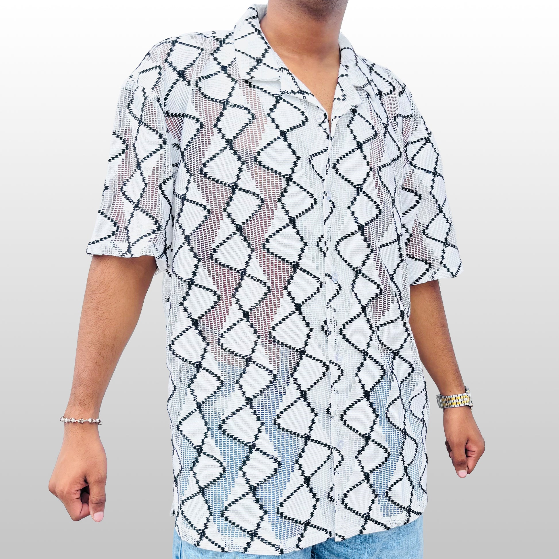 The Graphic Mesh Shirt is a powerful statement piece defined by its high-contrast geometry. This shirt features an eye-catching black lattice pattern woven over a crisp white base, creating a bold, three-dimensional mesh texture. The open-weave construction provides excellent ventilation and lightness, making it an elevated essential for warm weather. Its relaxed fit and classic resort collar deliver sophisticated, modern style. Pair with tailored black trousers to emphasize the graphic contrast, or wear it open over a white crewneck tee for a dynamic, high-end layered look.