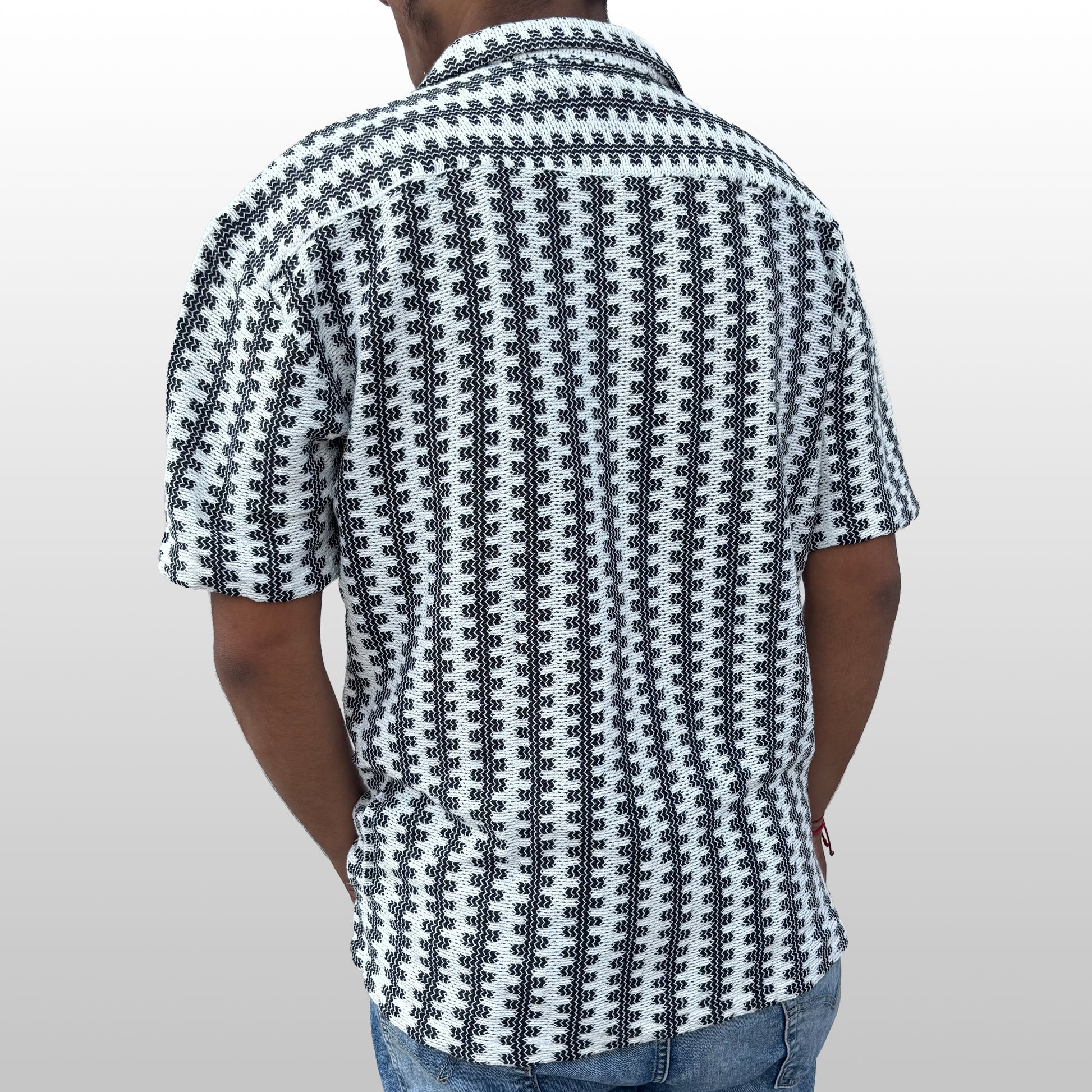 The Geo Stitch Shirt is a study in fine, structured pattern work. This piece features clean vertical stripes composed of small, repeating geometric stitches in high-contrast black and white. The intricate knit creates a dense, graphic texture and a polished look. Its relaxed fit and classic resort collar make it a sophisticated, contemporary essential that adds precise detail to any outfit. Pair this shirt with tailored black trousers for a sharp, refined aesthetic, or wear it with white denim or shorts to emphasize the crisp, high-contrast pattern.