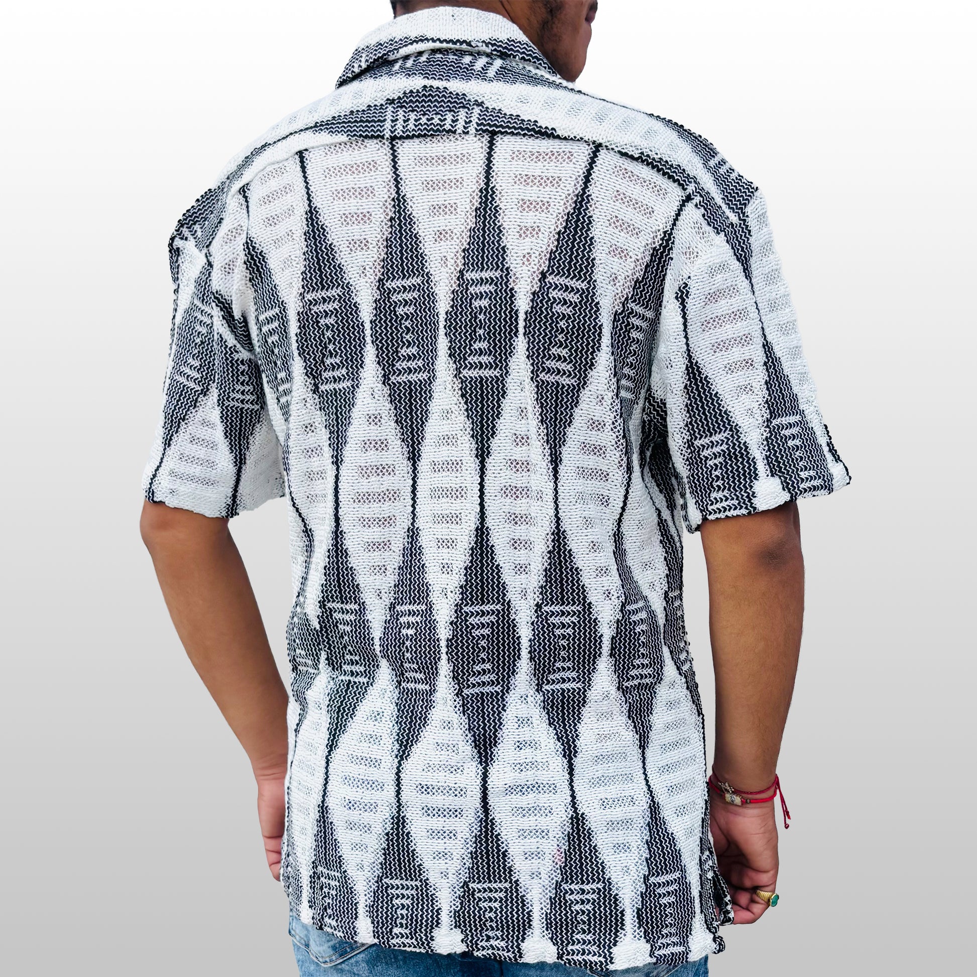 The Monochrome Argyle Shirt is a bold statement in geometry and texture. This piece features a striking black and white vertical diamond pattern that creates an elongated, architectural look. The high-contrast argyle motif is set within a breathable knit construction, offering both a rich, substantial texture and necessary comfort for warm weather. Its relaxed fit and classic resort collar make it a sophisticated, modern essential. Pair this shirt with tailored black trousers to anchor the dramatic pattern, or layer it over a clean white tee with dark wash denim for a striking, elevated casual aesthetic.