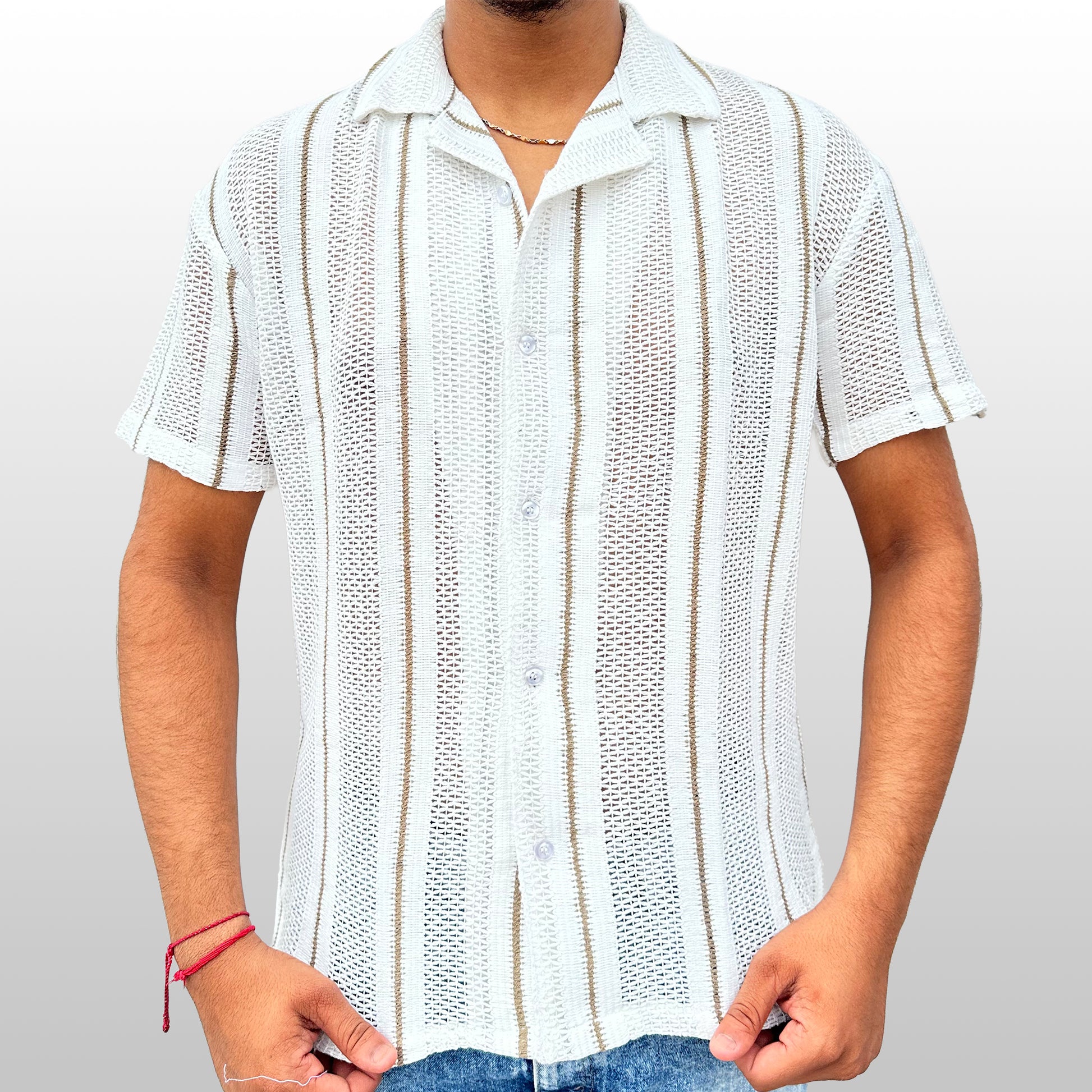 The Sleek Line Polo Shirt is the definition of refined summer texture. This shirt features clean, crisp white stripes alternating with thin brown lines on a fine, open-knit base. The vertical pattern creates a sophisticated, elongated silhouette, while the open weave ensures maximum breathability and a refreshingly lightweight feel. Its relaxed fit and classic resort collar make it a modern essential for elevated casual wear. Pair this shirt with tailored white shorts or light beige trousers for a clean, coastal aesthetic. For a layered look, wear it open over a plain white or brown crewneck tee.