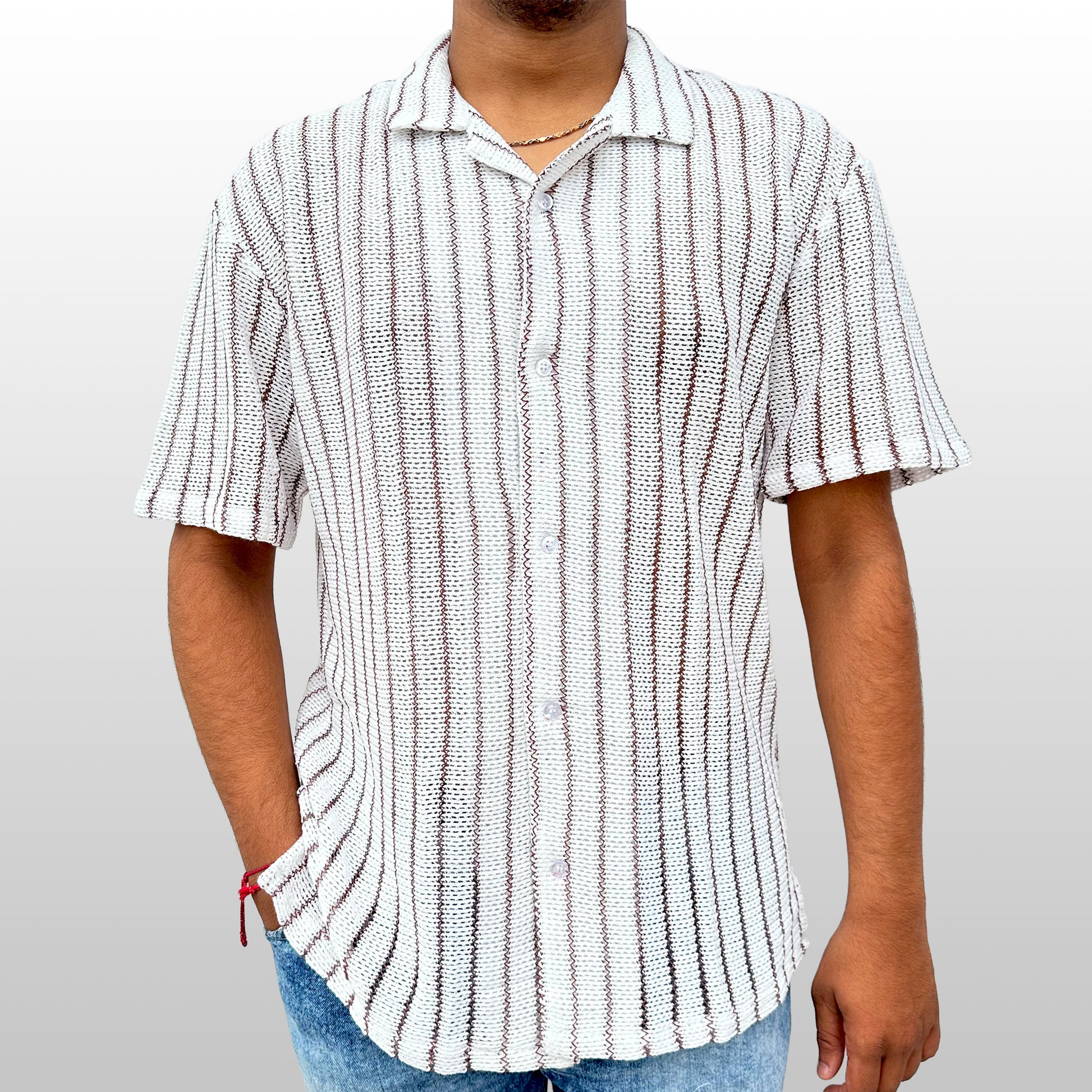 The Vented Line Shirt is the definition of refined, functional style. This piece features crisp white stripes accented by thin brown lines, all set within a fine, open-knit base. The vertical pattern creates a sophisticated, elongated silhouette, while the "vented" open weave ensures maximum breathability and a refreshingly lightweight feel. Its relaxed fit and classic resort collar make it a modern essential for elevated summer wear. Pair this shirt with tailored white shorts or light beige chinos for a clean, coastal aesthetic. For a casual look, wear it open over a plain white or brown crewneck tee.